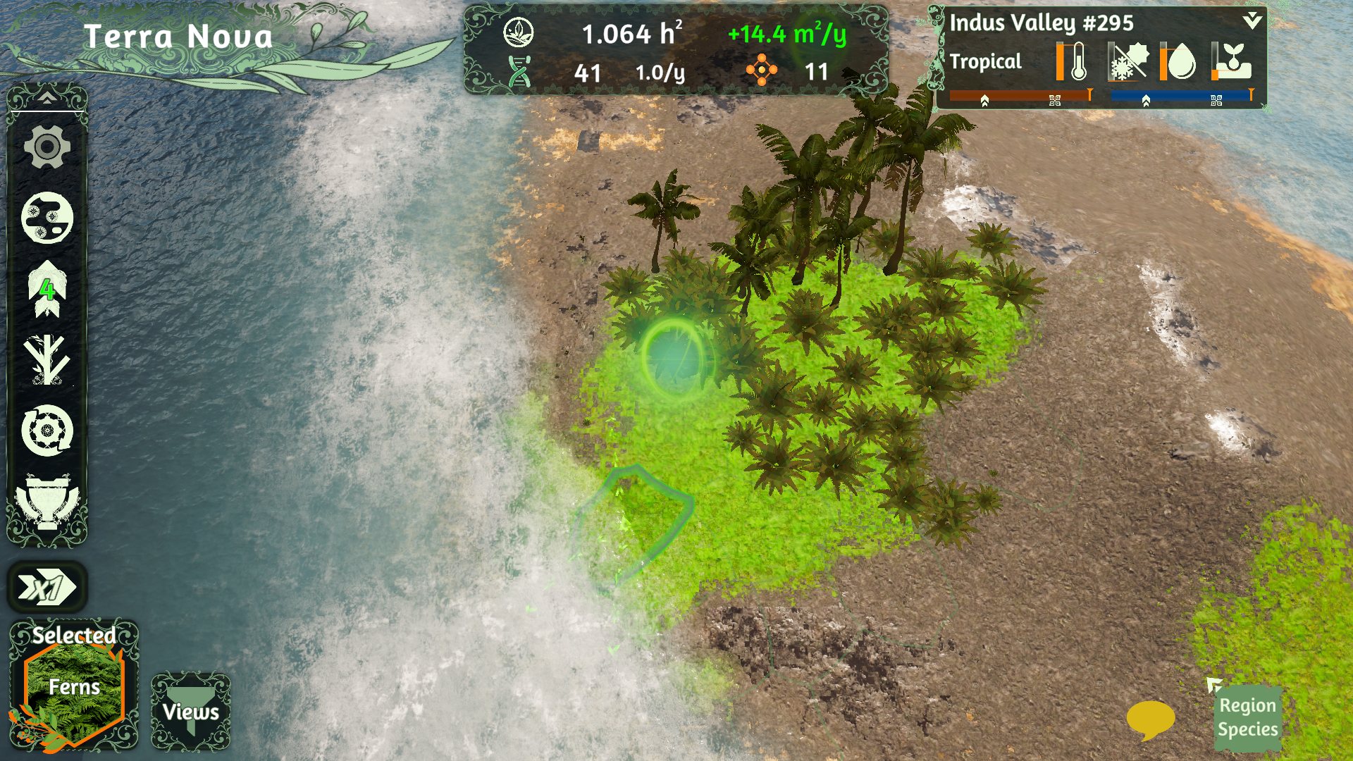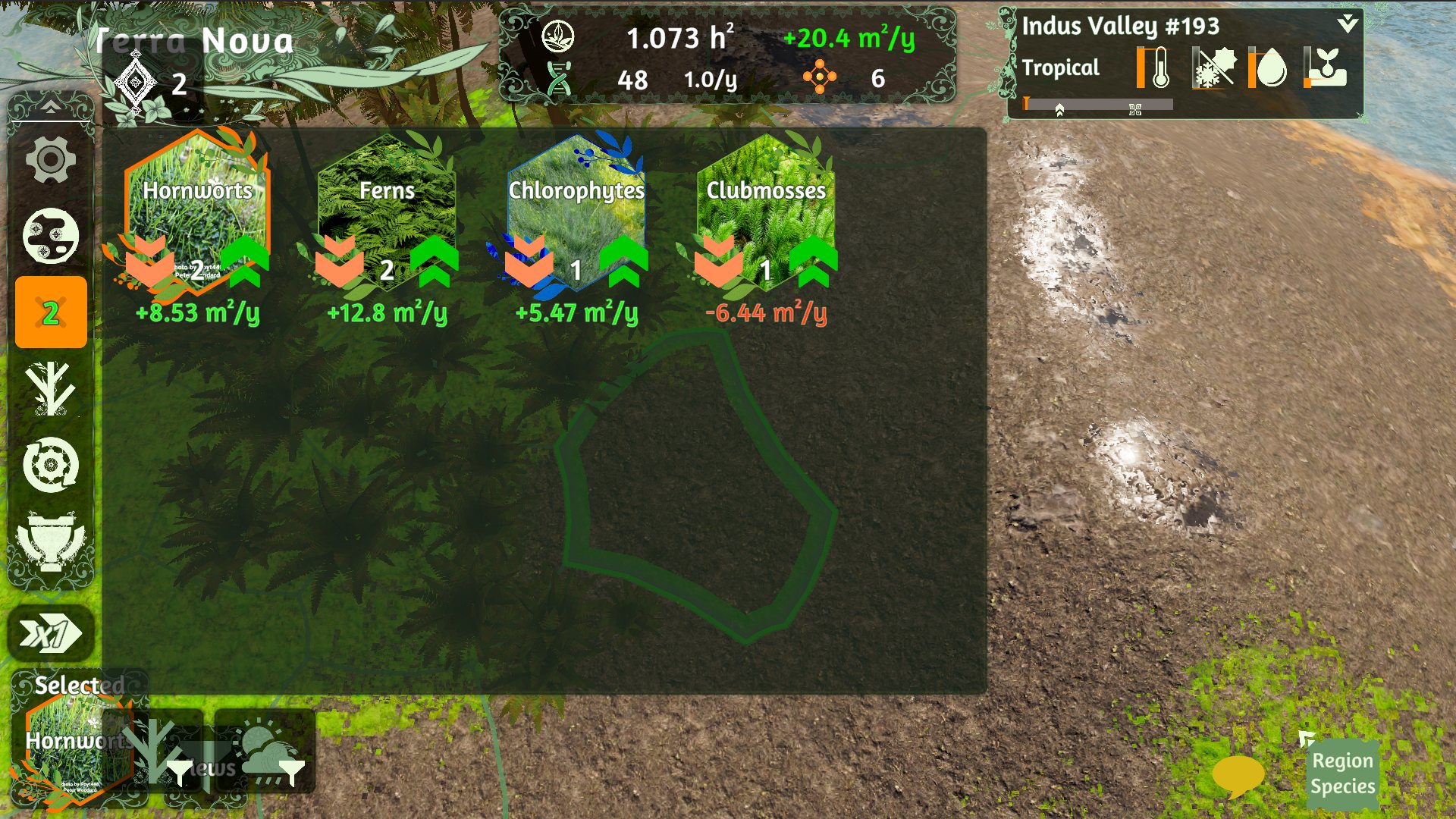 Survey the terrain and plan your botanical takeover. From dry highlands to soggy marshes, every region is waiting for the perfect plant species.