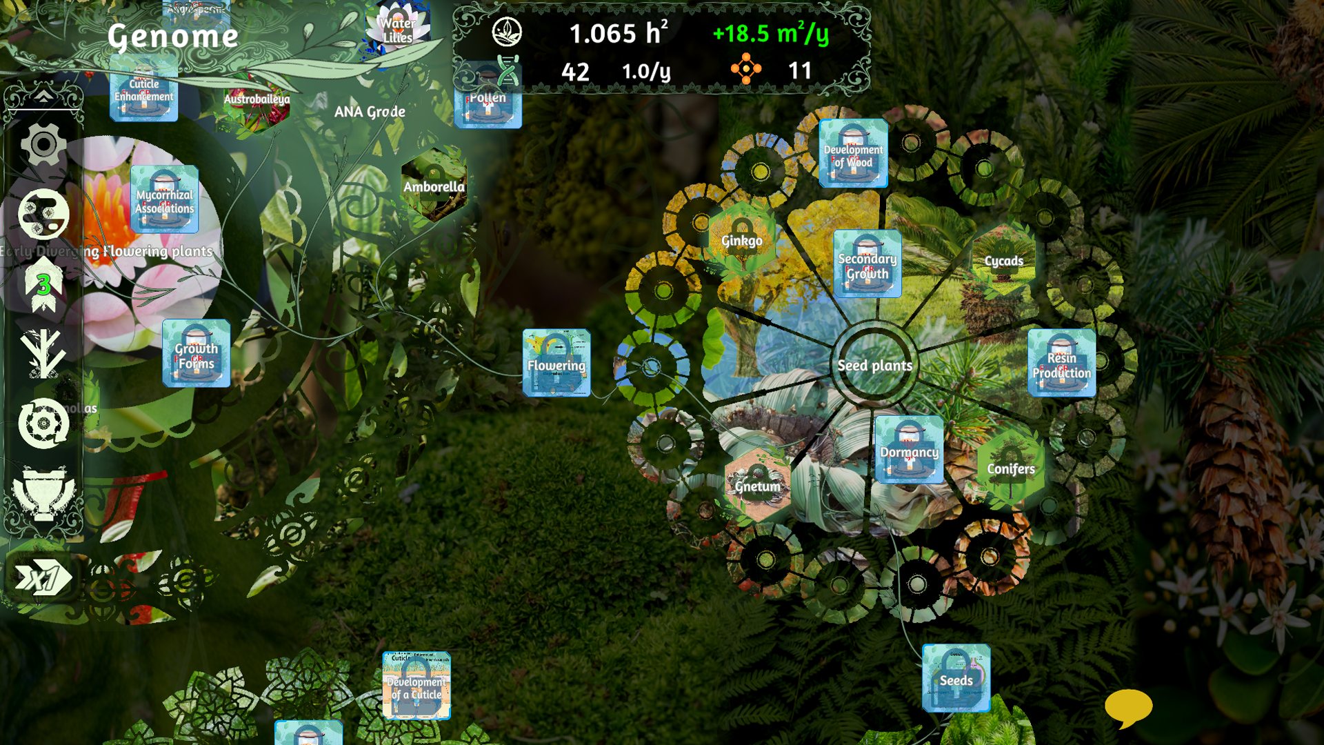Unlock real plant families and species through a genome tree tracing 1 billion years of history, then breed them strategically based on environmental conditions.